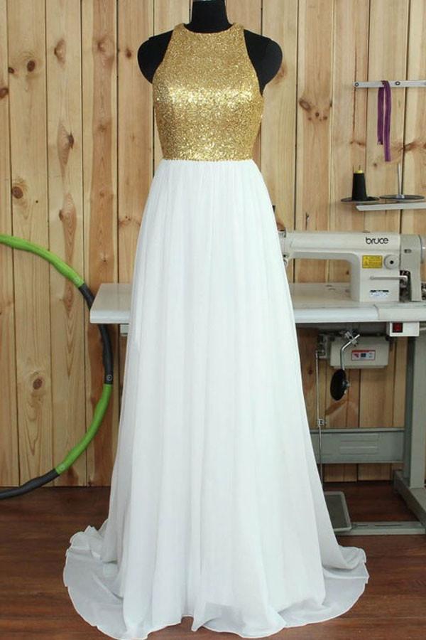 A Line Halter White Prom Dress With Gold Sequins JTA3631