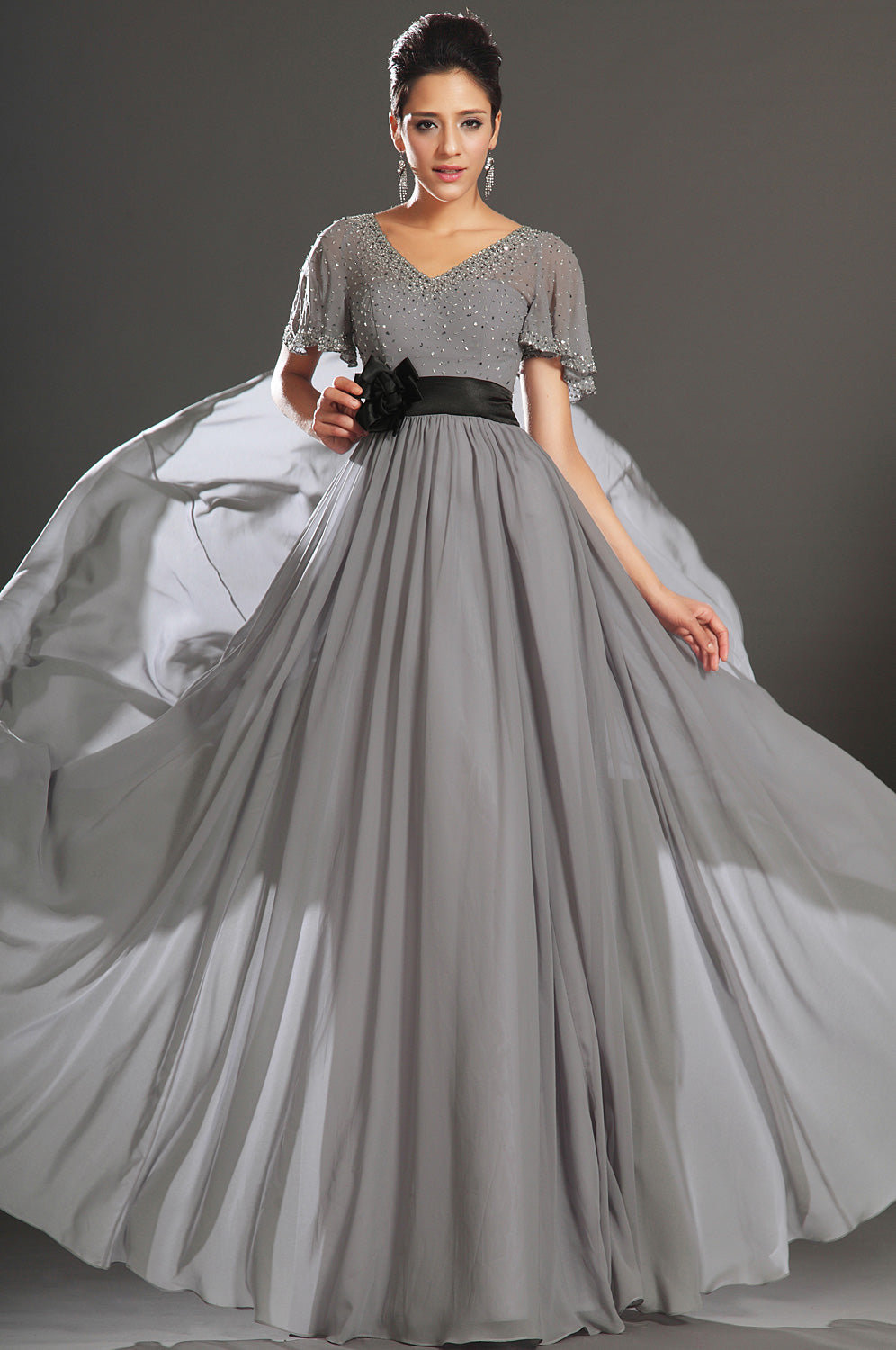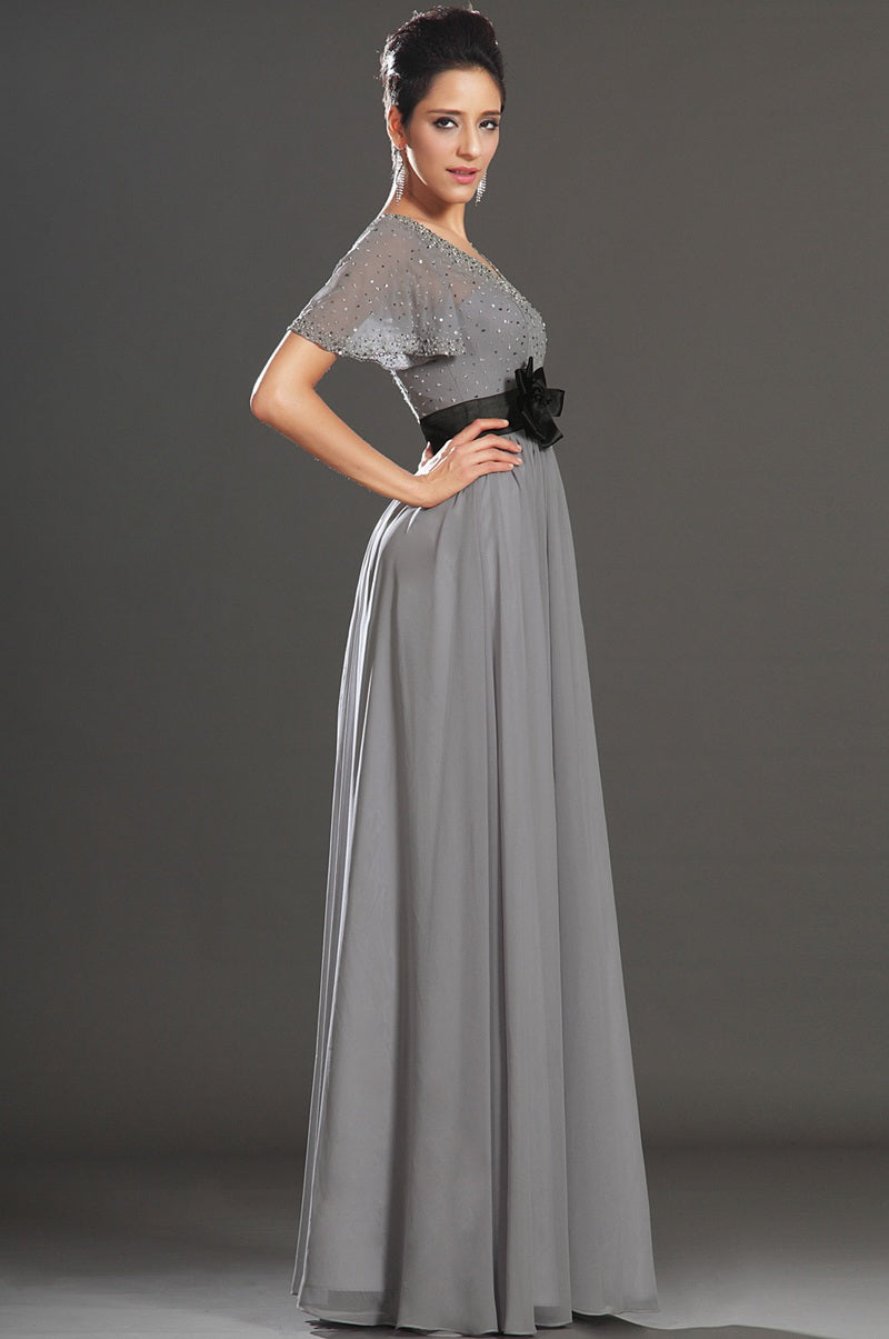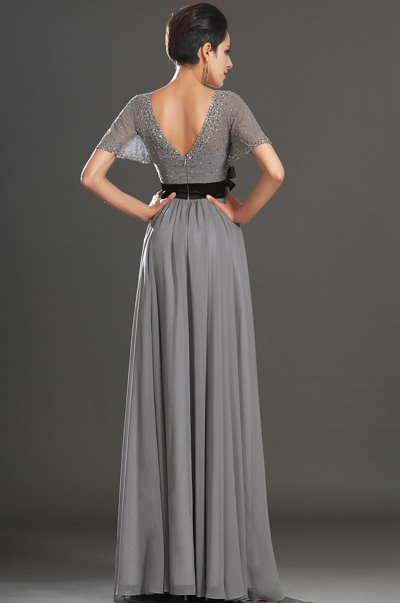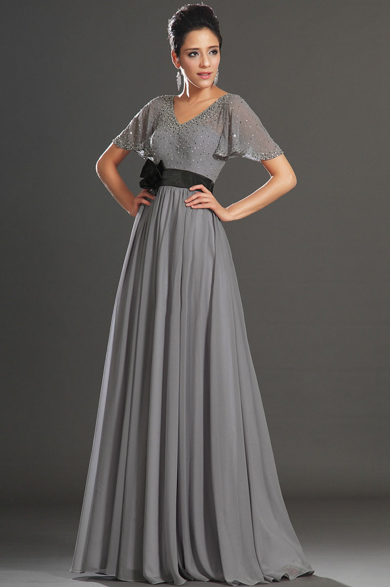 A-Line Silver Chiffon Beading Mother Gowns V-neck Short Sleeve Bridesmaid Dress(UKBD03-538)