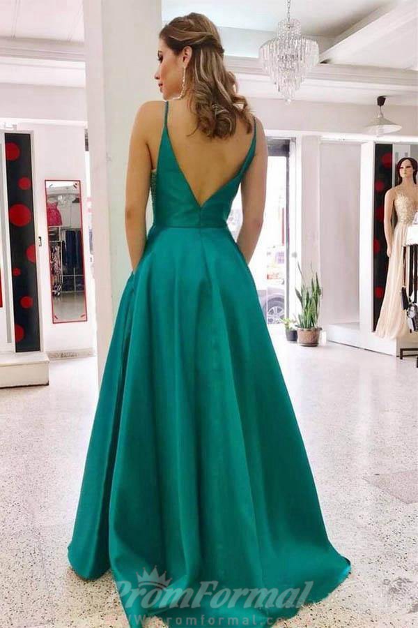 A Line V Neck Teal Satin Prom Dress with Pocket JTA9391