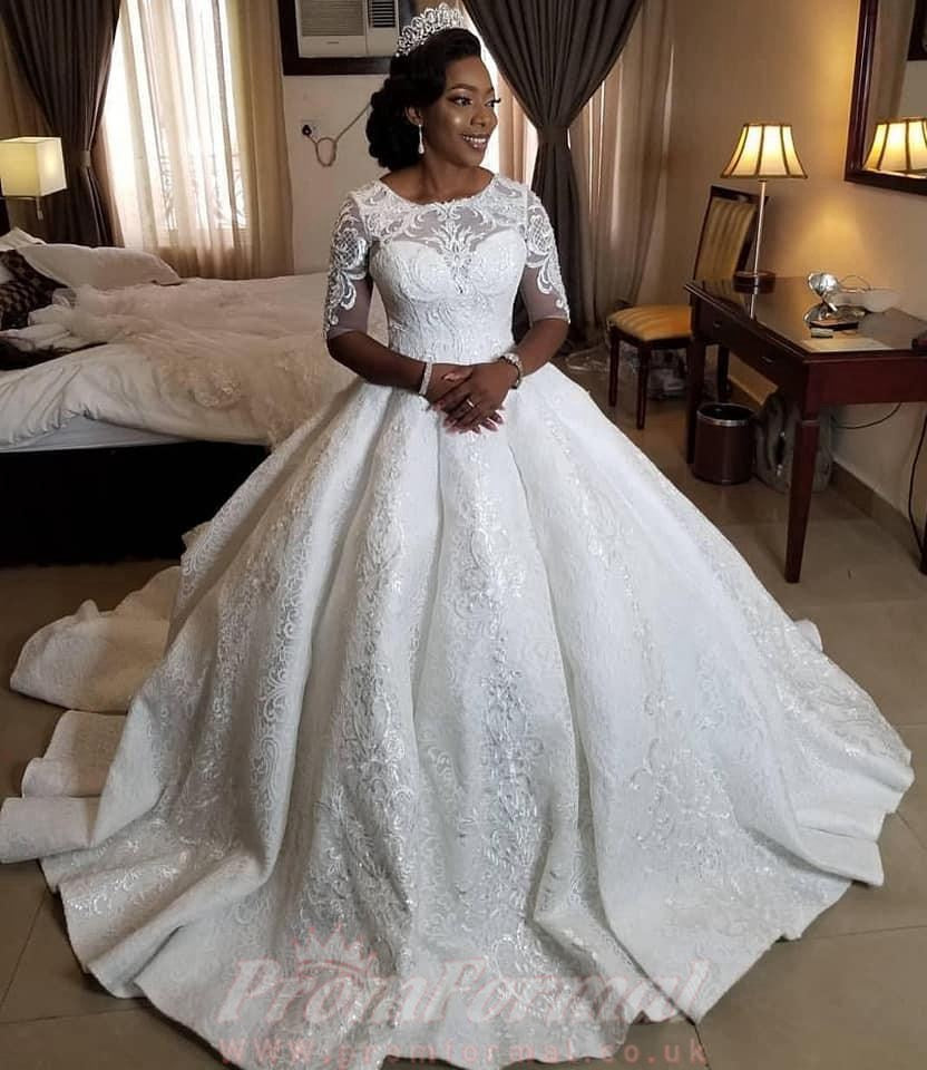Ball Gown Lace Half Sleeve Sweep Train Wedding Dress Black Brides BWD012