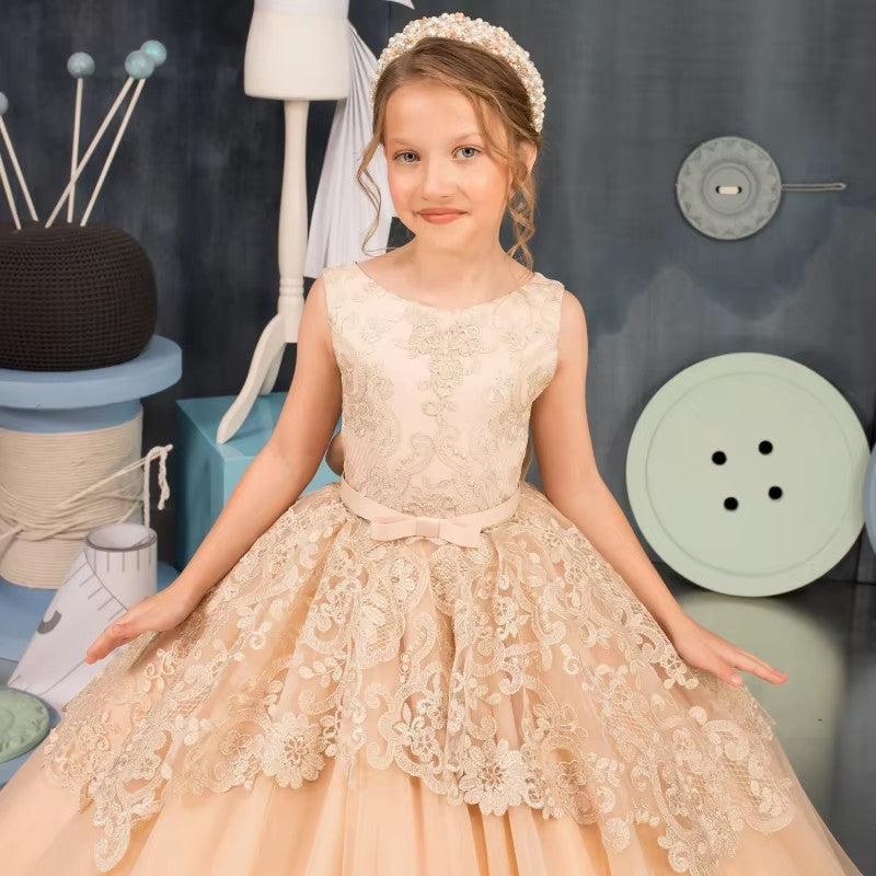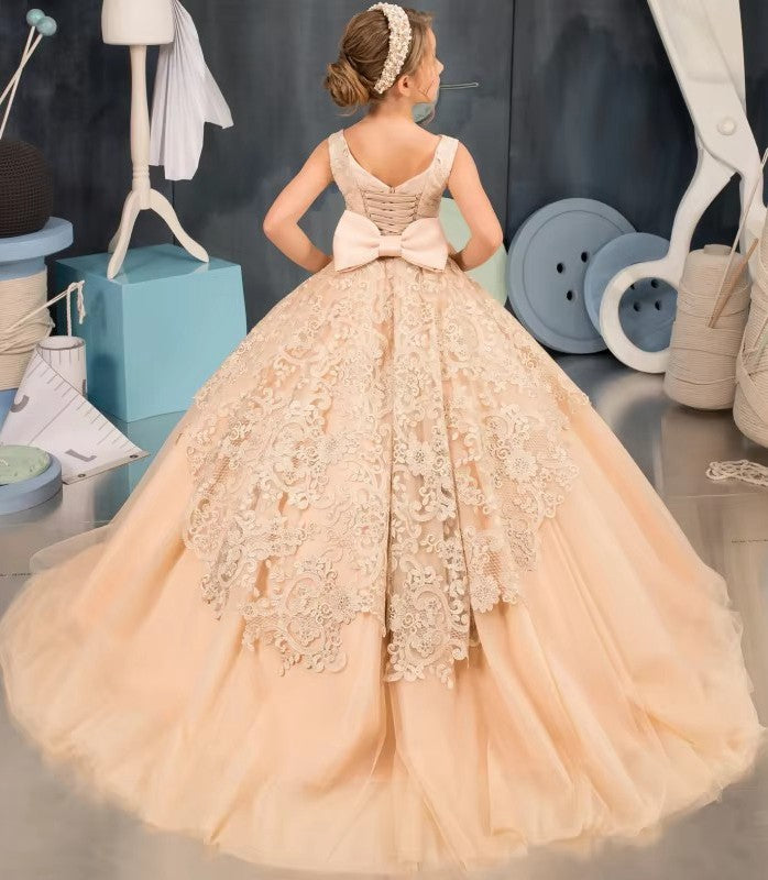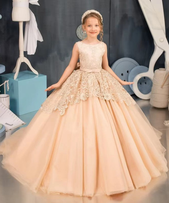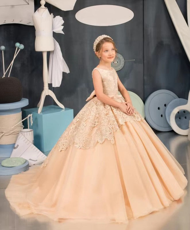 Champagne Lace Tulle Appliques Ball Gown Prom Dress With Bow CHK224