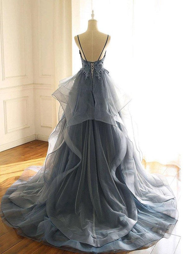 Dusty Blue Lace V Neck Long Ruffles Prom Dress JTA0161