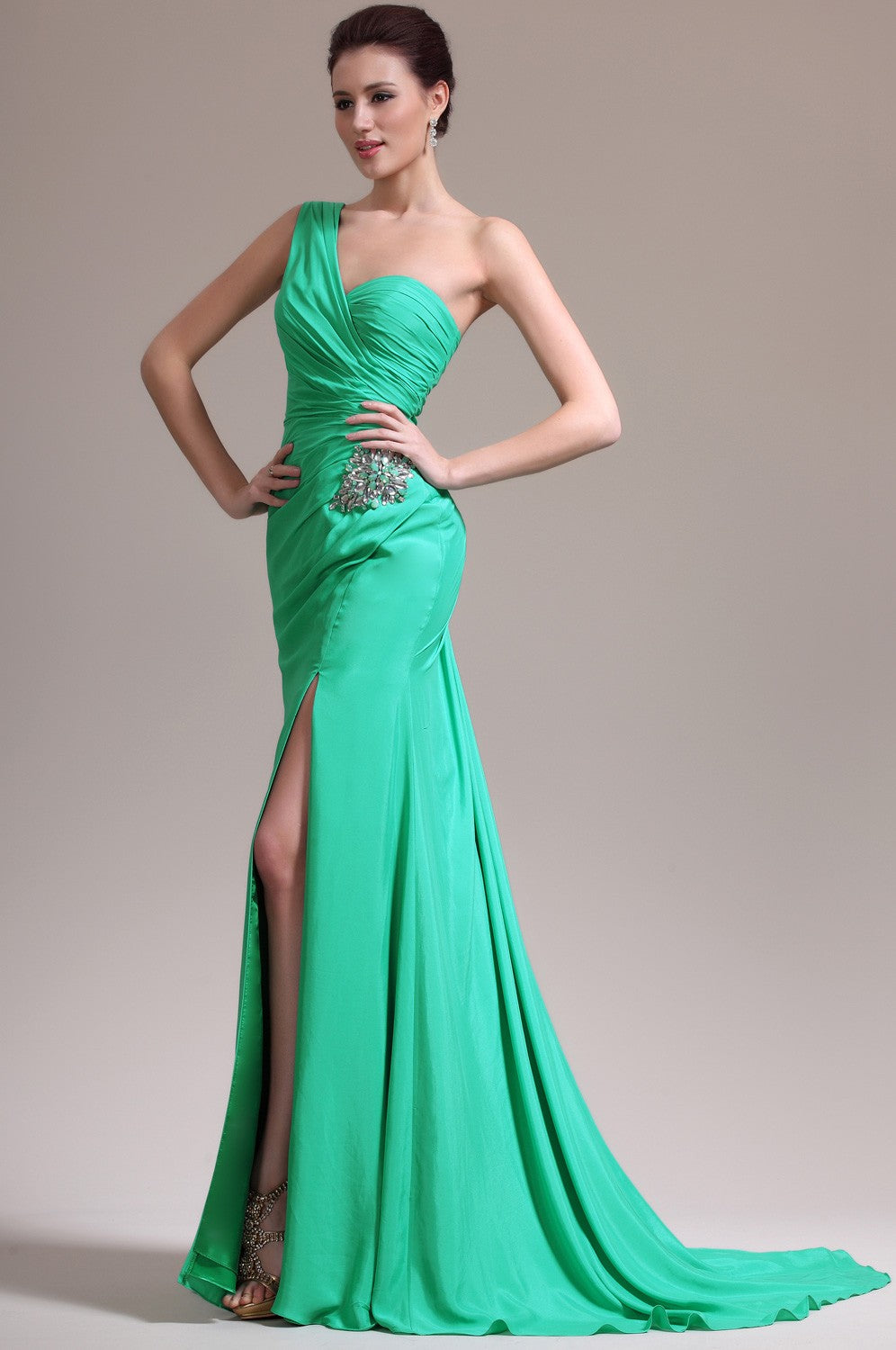 Green 100D Chiffon Trumpet/Mermaid One Shoulder With Split Front Bridesmaid Formal Dress(BDJT1343)