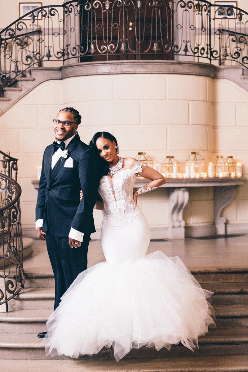 Ivory Plus Size Lace Plunge Off-shoulder Trumpet Long Sleeve Wedding Dress BWD057