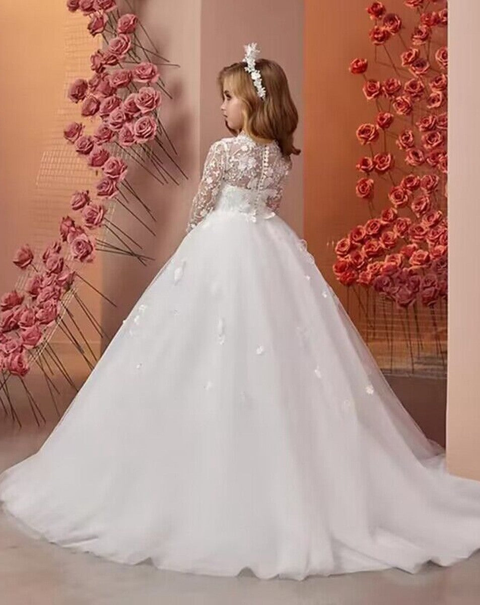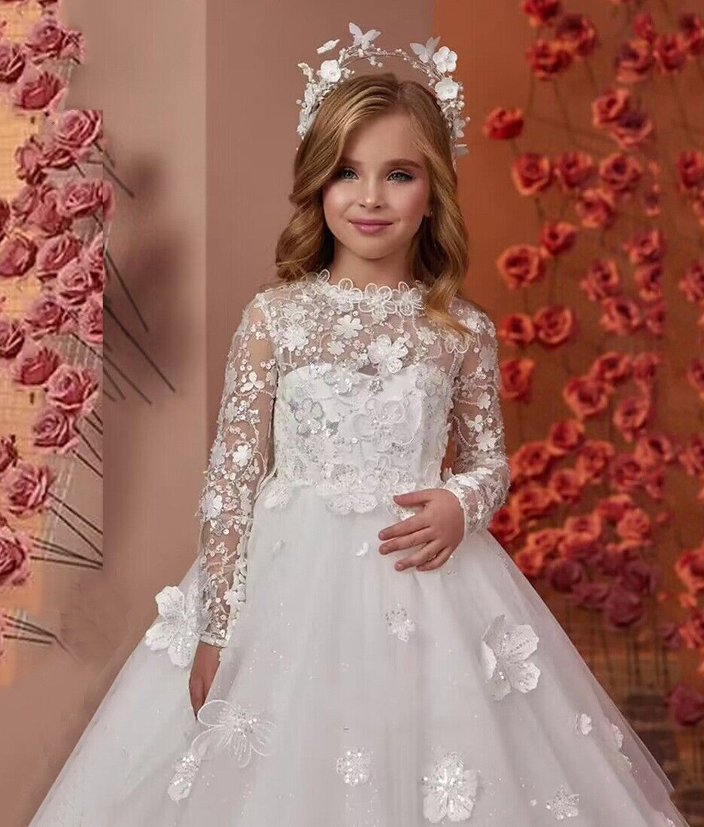 Lace Applique Ruffles Long Sleeve Communion Gowns Girls Formal Dress TXH123