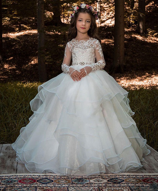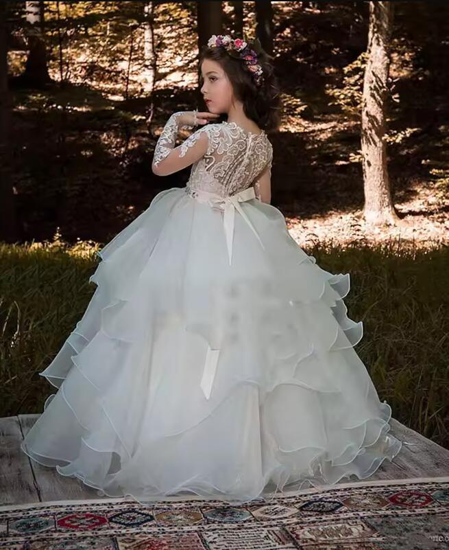 Long Sleeve Communion Gowns Lace Applique Ruffles Girls Pageant Party Dress TXH122