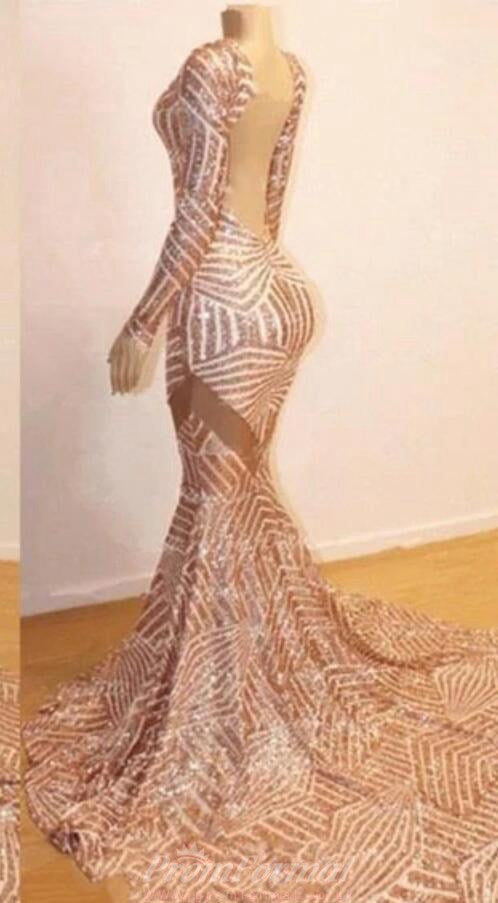 Mermaid Champagne V neck Sequined Evening Dress REALS171