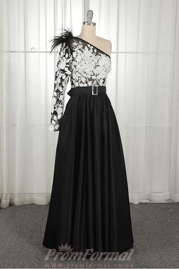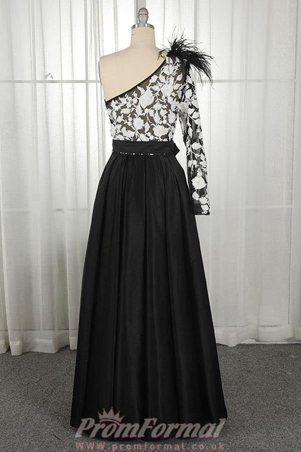 One Shoulder Black Split Prom Dress with Pockets Feathers JTA0391