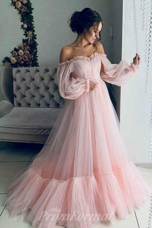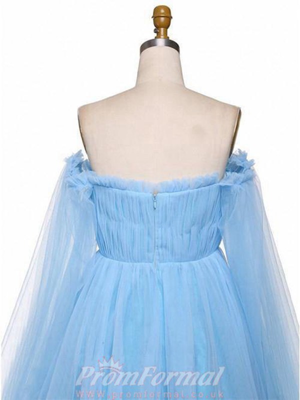 Sky Blue Tulle Off The Shoulder Long Sleeve Evening Dress JTA9711