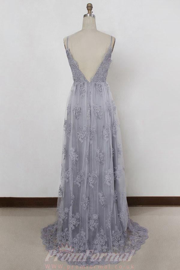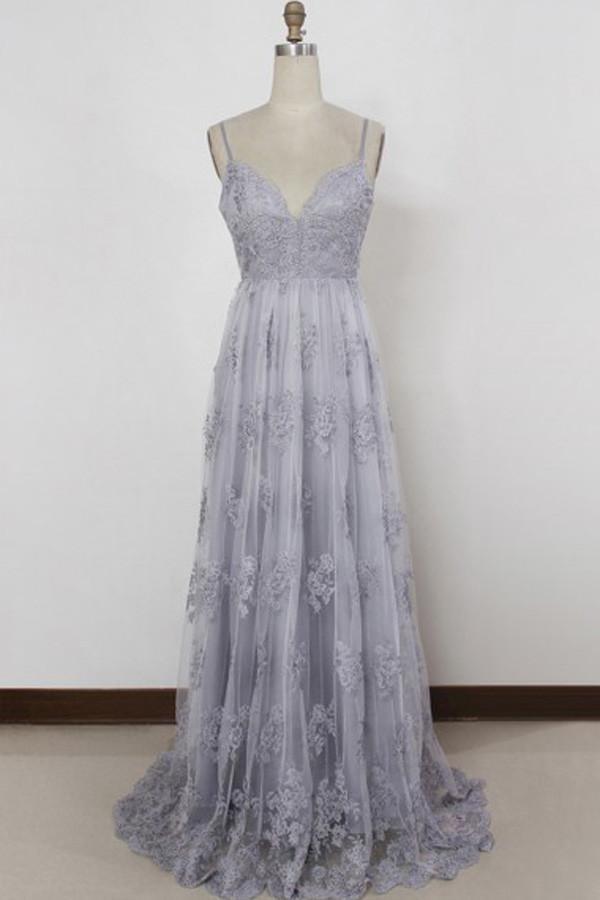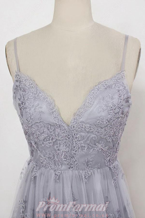 Spaghetti Straps A Line Silver Gray Tulle Prom Dress JTA3931