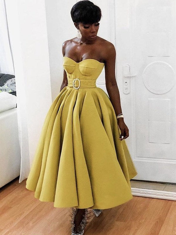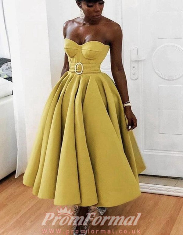 Sweetheart Tea Length Yellow Satin Prom Dress SHORT136