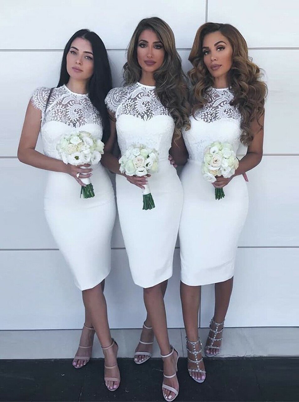 White Knee Length Round Neck Bridesmaid Dress GBD131